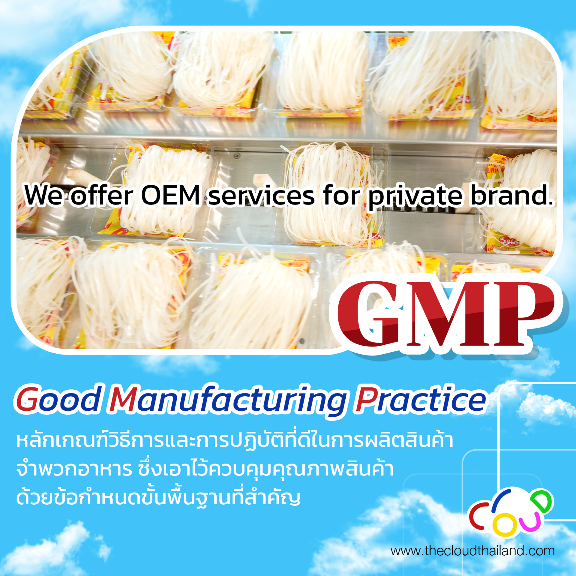 บริษัท เดอะคลาวด์ (ประเทศไทย) จำกัด ให้บริการ OEM แบบครบวงจร สำหรับผู้ที่ต้องการผลิตบะหมี่กึ่งสำเร็จรูป ผงเครื่องแกง ผงปรุงรส และซอสปรุงรส ทุกรูปแบบ ภายใต้แบรนด์ของลูกค้าเอง ด้วยมาตรฐานการผลิต GMP