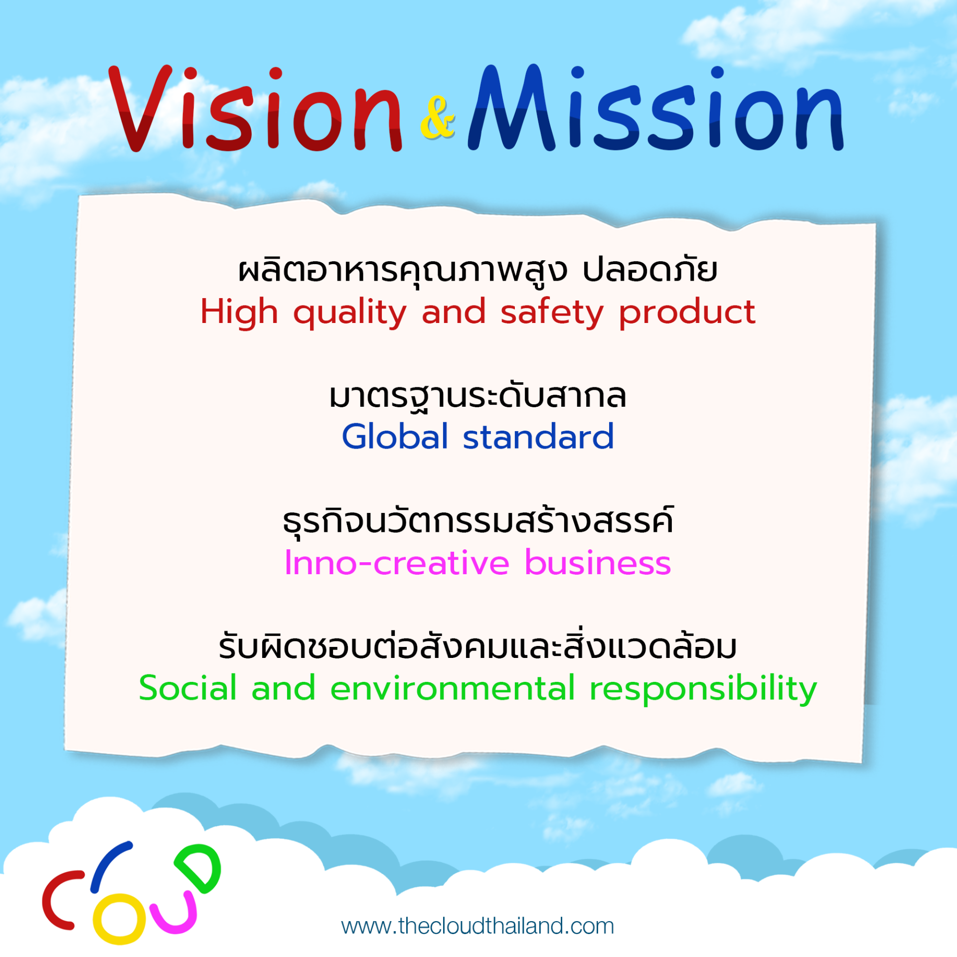 The Cloud (Thailand) Co., Ltd. is dedicated to producing Thai food with high-quality and safety in accordance with global standard, distributed to consumers worldwide. We operate our business innovatively, with a commitment to social and environmental responsibility.